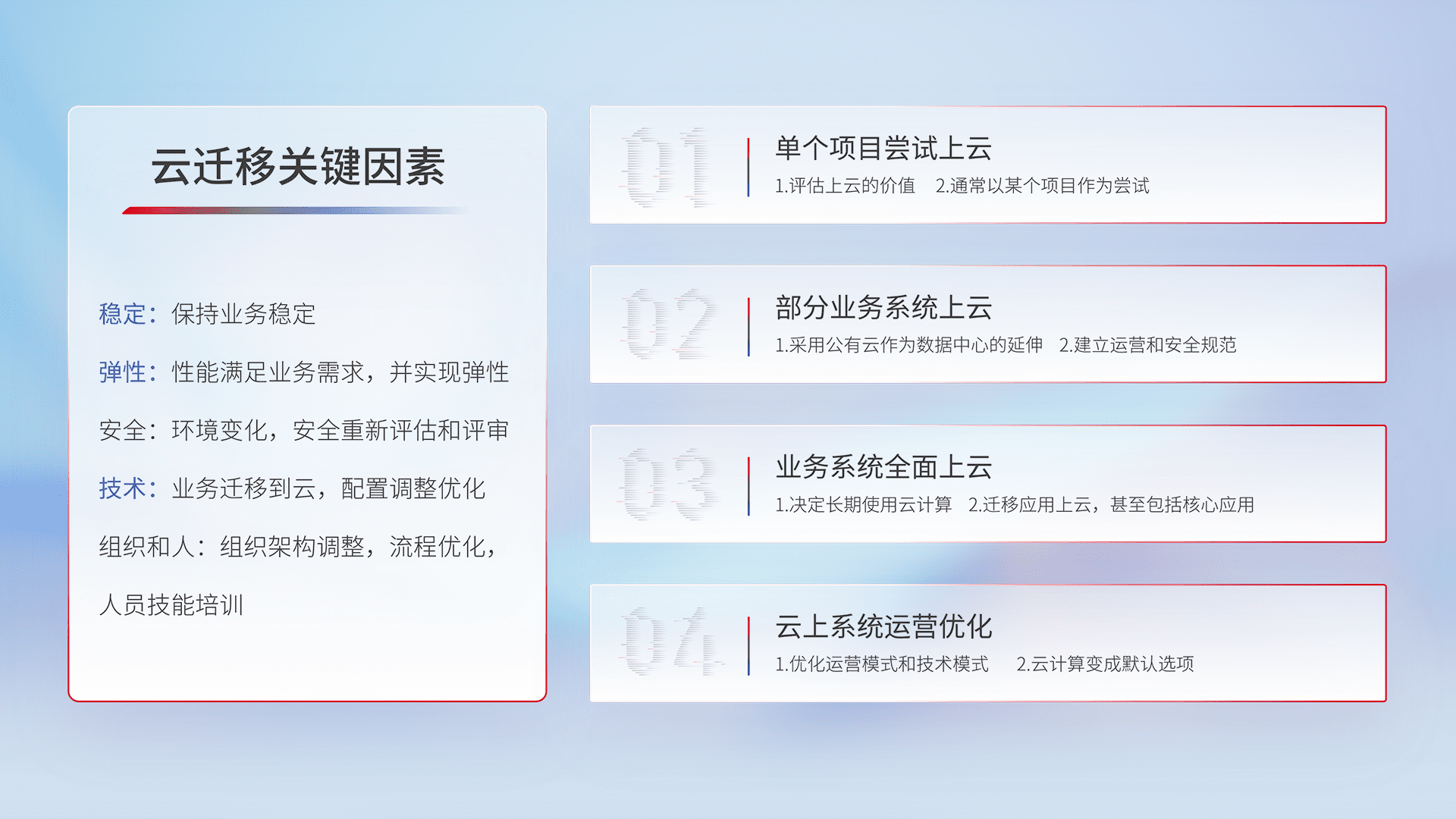 结合实际业务,,,从规划设计、、、云平台选型、、、云原生改造、、、数据迁移、、集成交付,,,,迁移全过程为客户识别最佳上云路径,,,做好风险识别管理,,,设计网络架构、、身份权限、、安全审计合规、、、、操作审计、、、日志审计、、、监控告警策略、、、、多站点容灾设计等,,对云上基础设施进行整体规划,,,,提升IT治理水平,,,,以满足弹性、、、、高可用、、高性能的需求。。。
